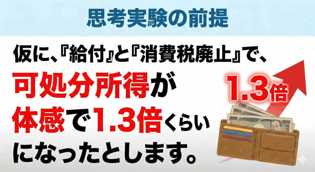 仮に、給付と消費税廃止で、可処分所得が体感で1.3倍くらいになったとします。
