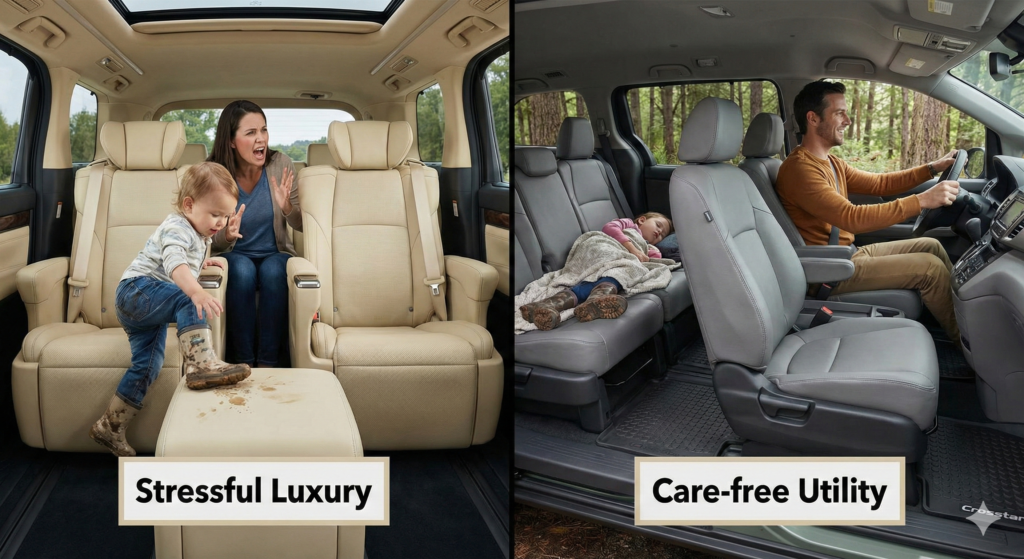 - × 高級革シート→ ○ 撥水ファブリック